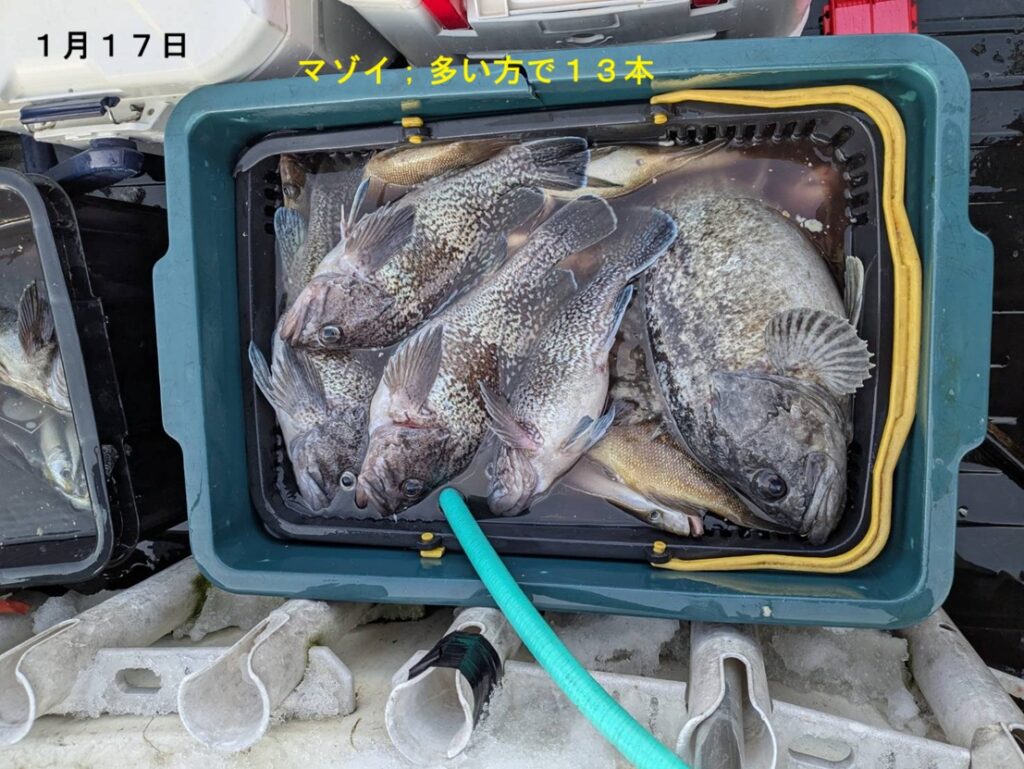 ※ソイ類のサイズはマゾイが最大35cmで良型は少なめでした。そして、クロゾイは型が大きく50cm台3本、60cmも上がってました。シマゾイは1本で28cmです。